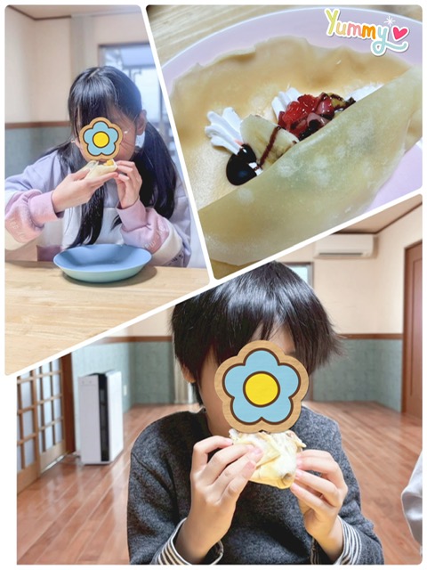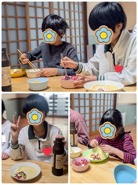 いちごやバナナ、マンゴー等、好きなフルーツを並べて生クリームやチョコソースをかけてトッピングしました。どうやってフルーツを並べようか真剣に考えながらトッピングしている子もいました🤭生クリームが大好きな子も、前回作った時に包みにくかった経験を活かして生クリームの量を考えながら乗せていました。