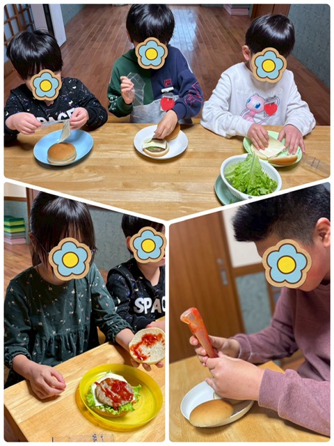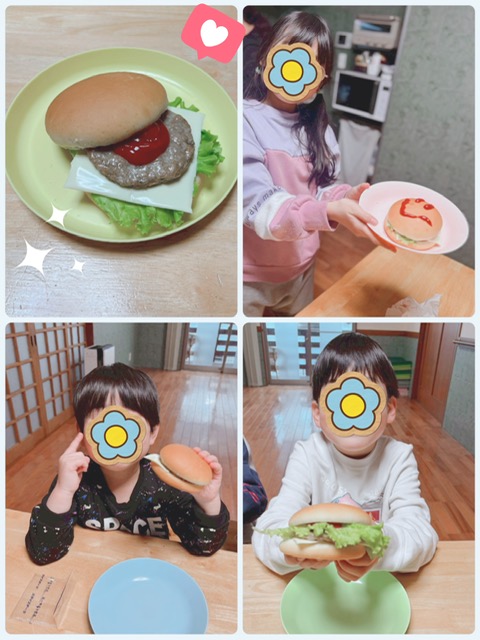 Kちゃんは、ハンバーガーの上にケチャップでににこにこ顔を描いて満足そうにしていました。お友達やスタッフに「かわいいね!」「すごい!」と言われて嬉しそうにしていました😊