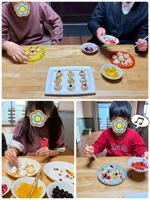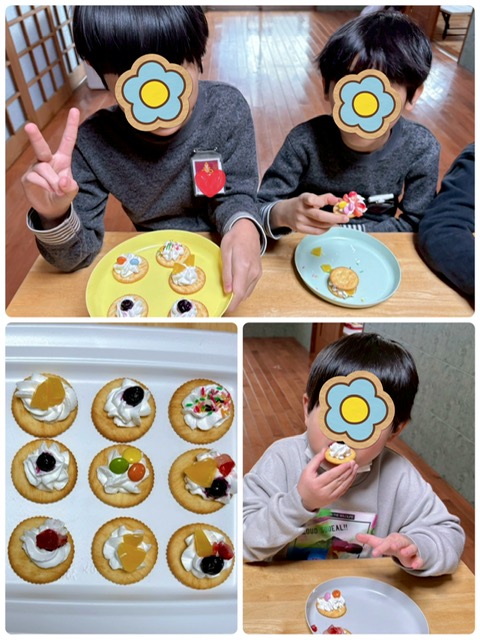 リッツの上に、生クリームを乗せて、ブルーベリー、イチゴ、桃、マーブルチョコ等を好きなトッピングを組み合わせ楽しみました。「何にしようかなぁ」とトッピングを悩みながらも思い思いに飾り付けをしていました。