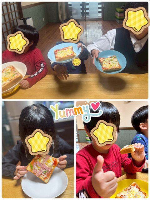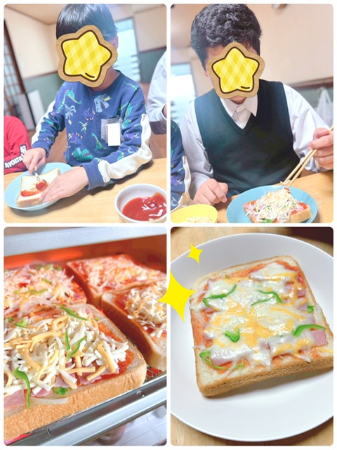 食パンに、ケチャップやピーマン、ベーコンにチーズをトッピングして、トースターでこんがりと焼きました!