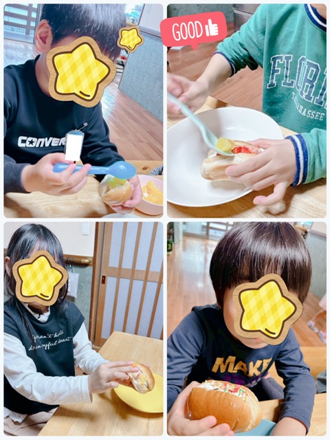 ロールパンに、ウインナー、レタス、チーズ等の具材を挟み、最後にケチャップをかけたら完成です✨