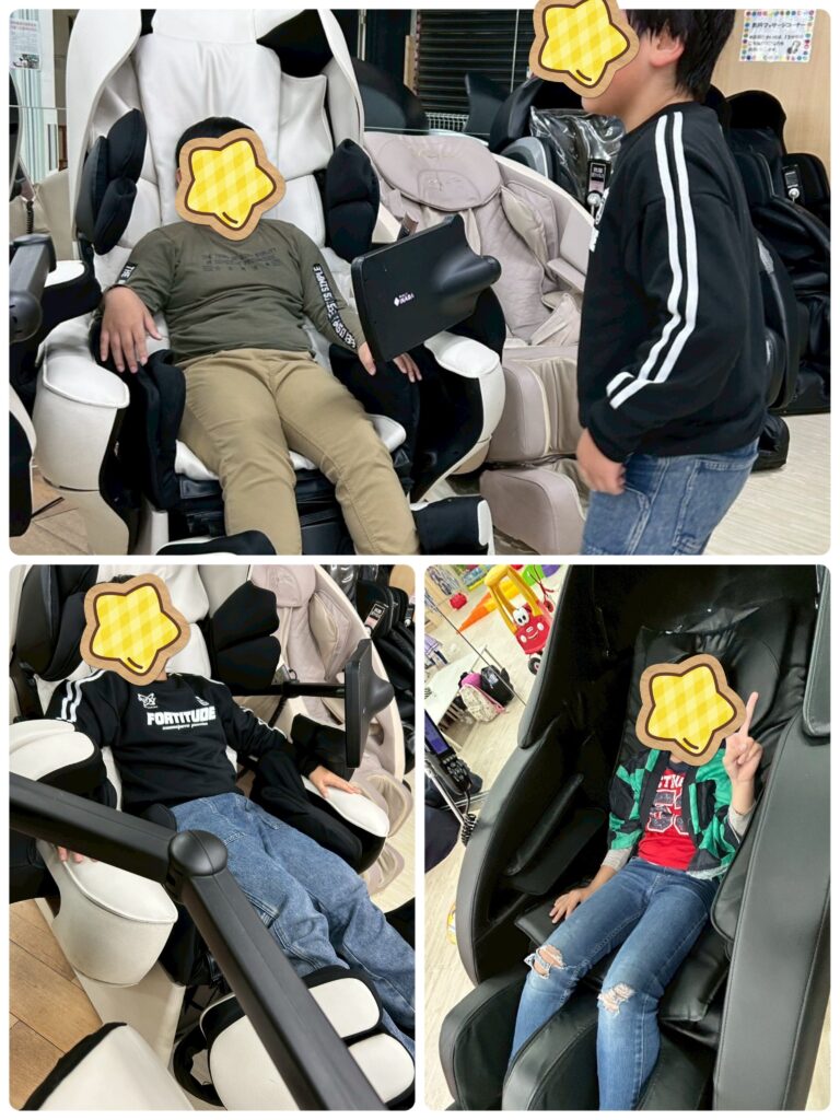 遊びつかれた後は最新のマッサージチェアに乗り、「先生、今年の疲れは今年のうちにとっとこー」とスタッフを誘ってくれて一緒に疲れを取りました🥰