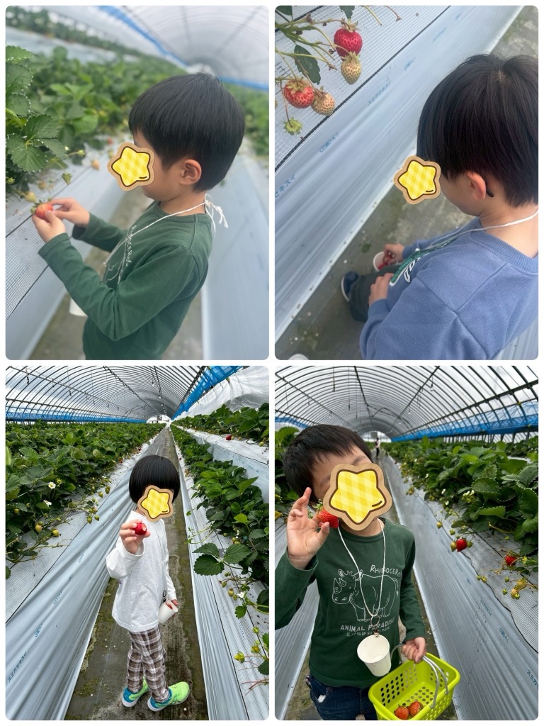 ハウスについて、ハウスの人からお約束やルールを聞いて、しっかりルールを守って、時間いっぱい楽しみました。どのいちごが美味しいか聞いたり、どの大きさが食べごろなのか教えてもらって、これがいい、美味しそうと嬉しそうな声が沢山聞こえてきました。時間いっぱい楽しんで笑顔が沢山の子ども達でした😊
