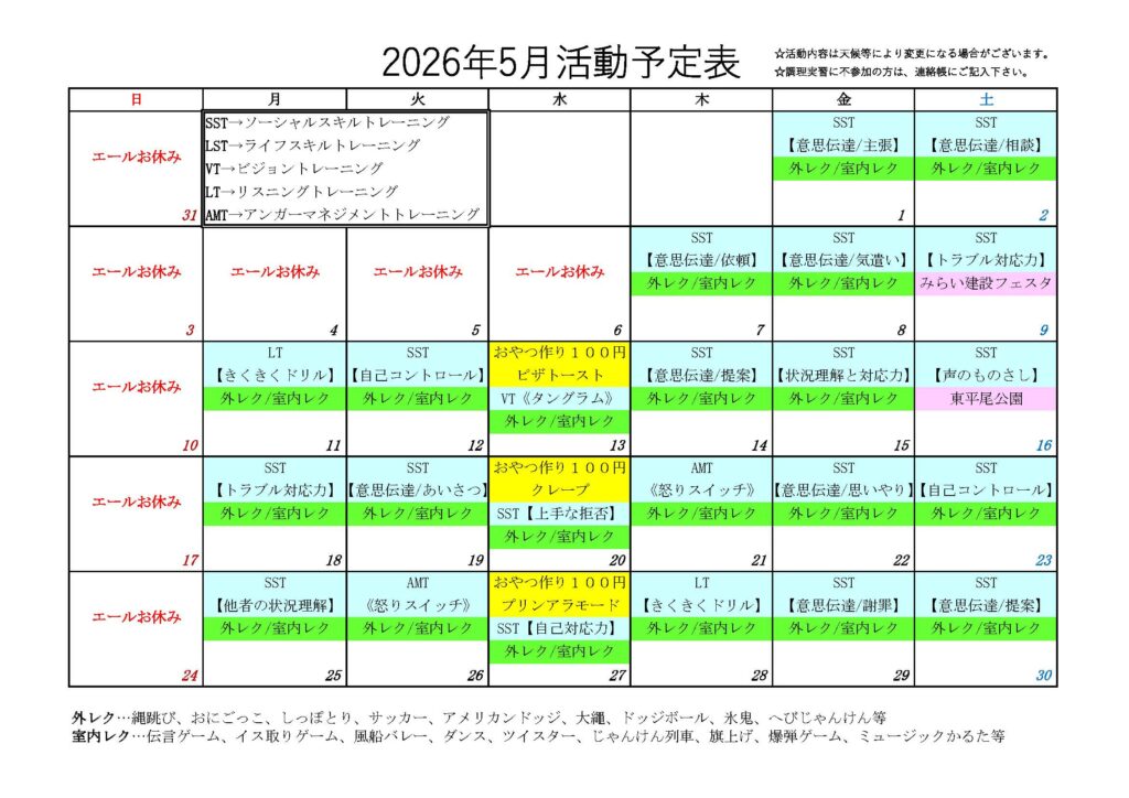 今月の活動プログラム 2025年度活動プログラムはこちら 一日の流れ サービス提供時間 平日学校終了時間〜18時まで土曜日10時半〜15時30分まで長期休暇10時半〜15時30分まで ※時間に応じて対応させていただきます。